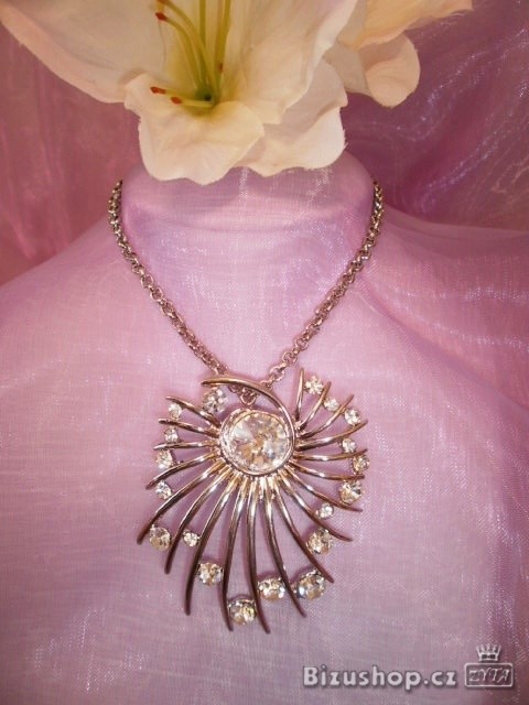 Řetízek s přívěskem zdobený Českými skleněnými kamenyNáhrdelník ve stříbrné upravě kovu s výrazným přívěskem v originálním tvarem bohatě zdobený Českými skleněnými kameny v barvě krystal . Délka náhrdelniku