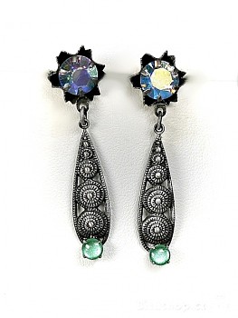 Retro Visací náušnice  odlehčené s krásnými skleněnými  duhovými  kamínky. a jemným gravírem .Tmavá  galvanická úprava. Jablonecká bižuterie