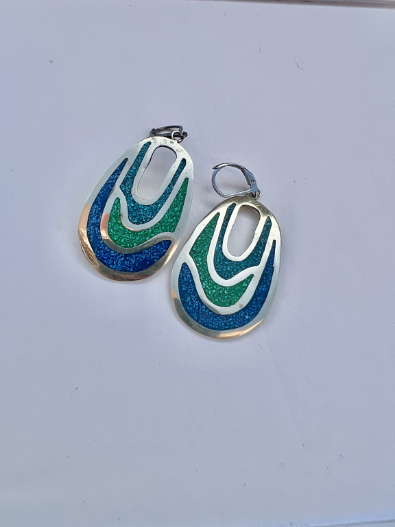 Top Náušnice z Alpaky .Exklusivní dámské visací náušnice v barvě tyrkys a modrá z Peruánské Alpaky . Délka náušnice včetně zapínání z chirugické oceli na klapku 6 cm, šířka 3 cm.