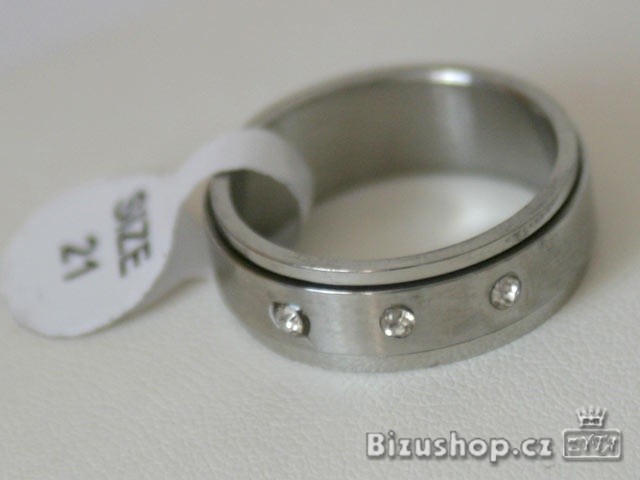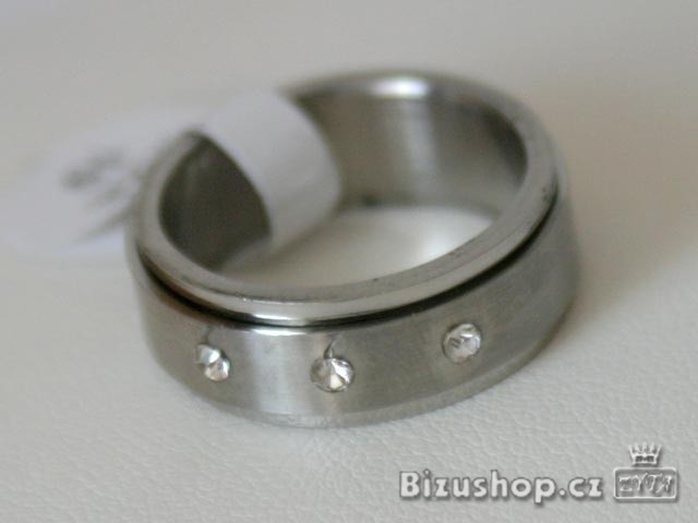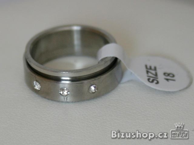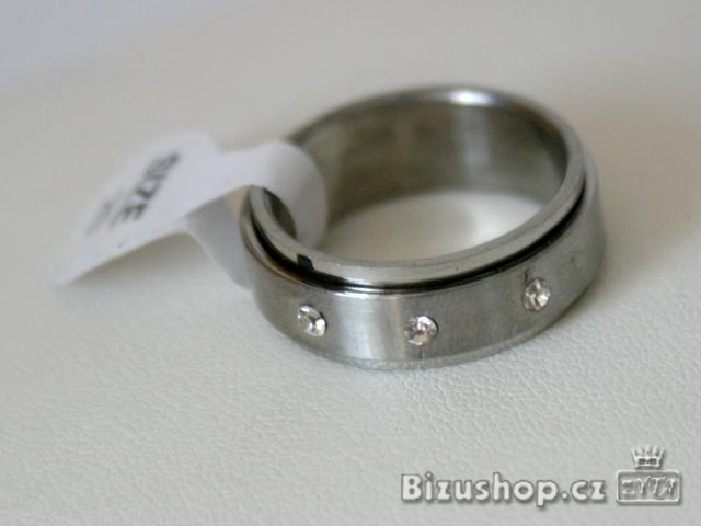 Prsten z lesklé chirugické oceli ze dvou dílů. Venkovní otočná část se třemi skleněnými kamínky se otáčí na vnitřní části prstenu.Zlatnická velikost prstenů 53,57,60,63,66.
